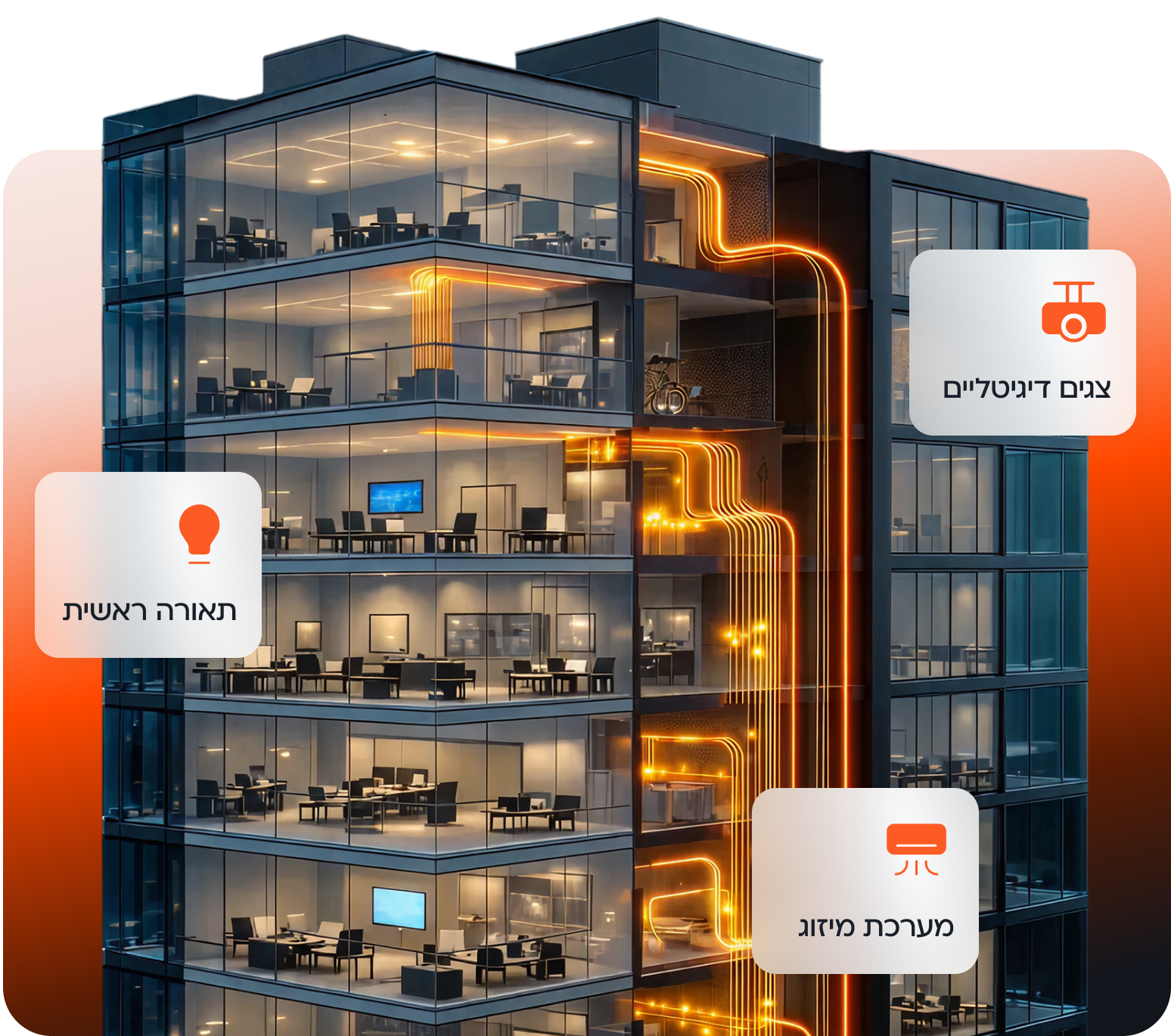 זנטרו מאחדת את כלל מערכות המבנה למערכת שליטה אחת, מסונכרנת וברורה, המאפשרת ניהול מרכזי ופיקוח מלא על כל רכיבי התשתית.