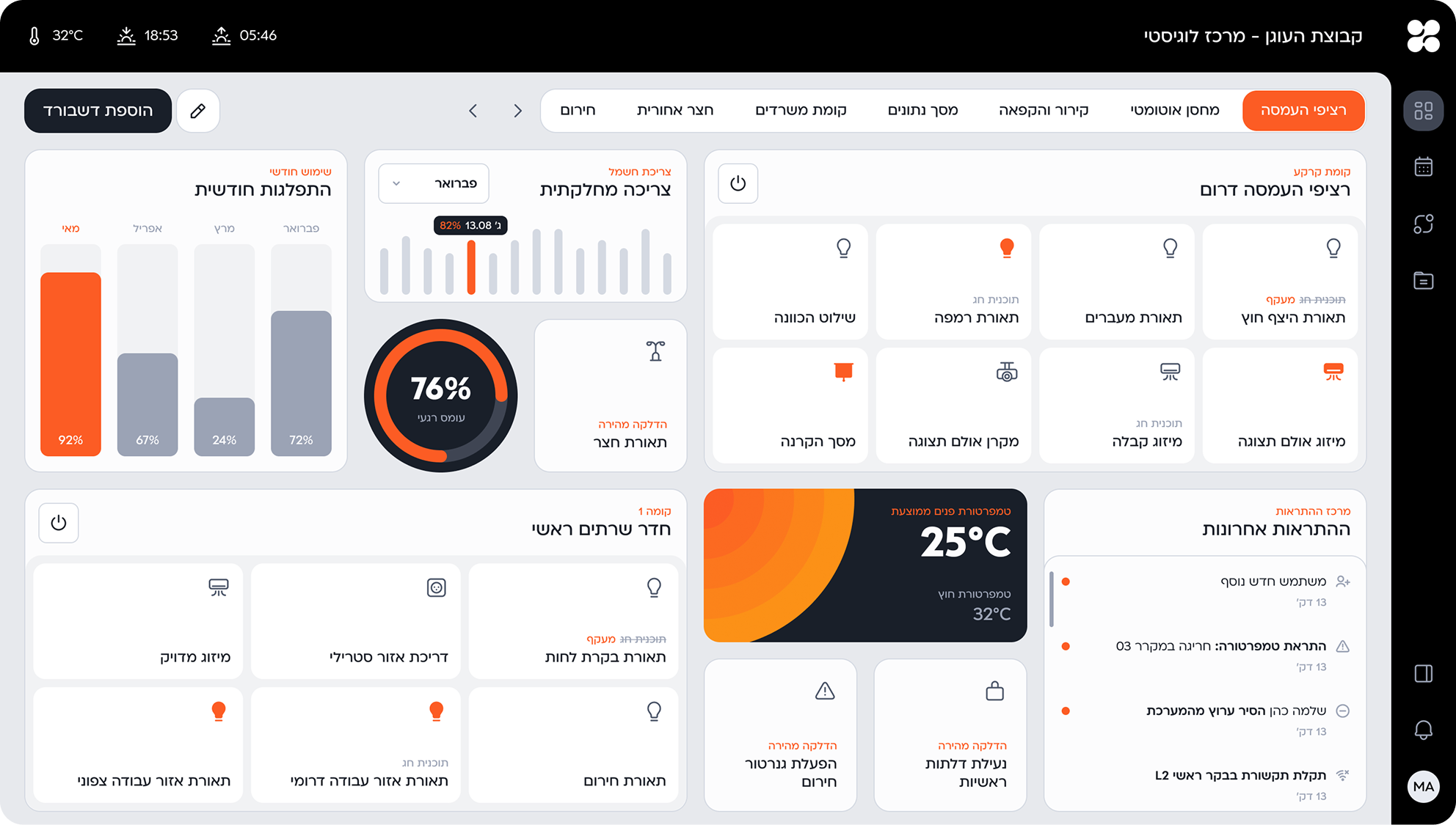 תאורה ומיזוג מוגדרים לפי משמרות העבודה במקום פעולה רציפה ומיותרת.