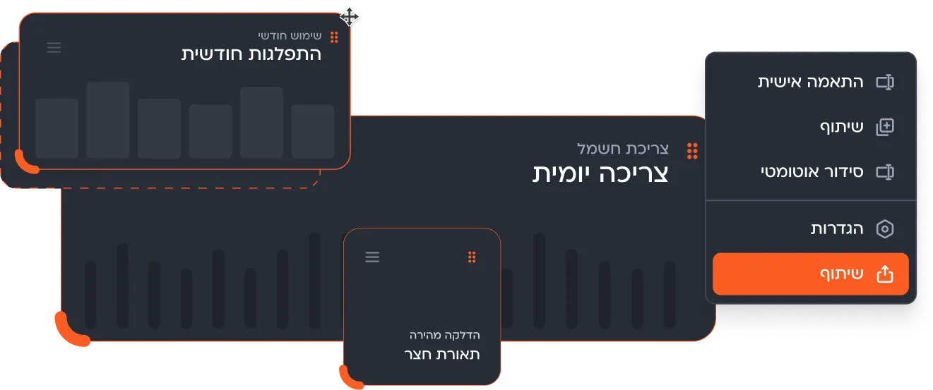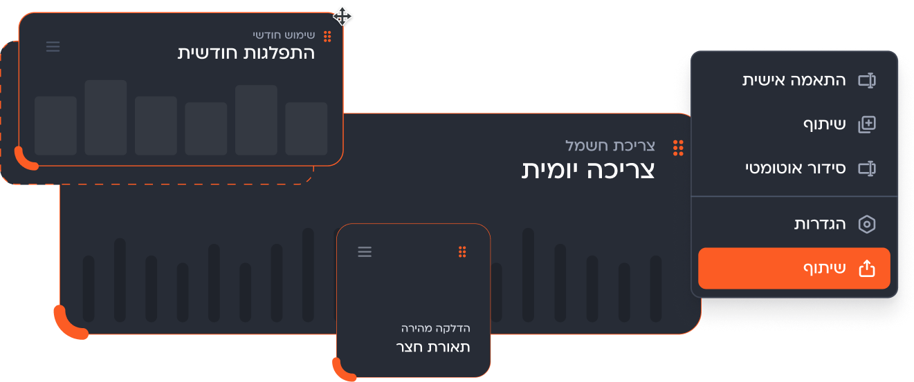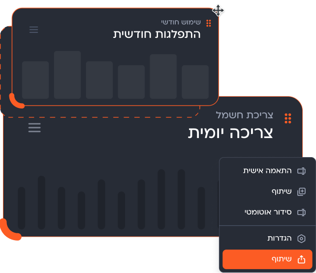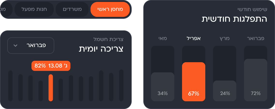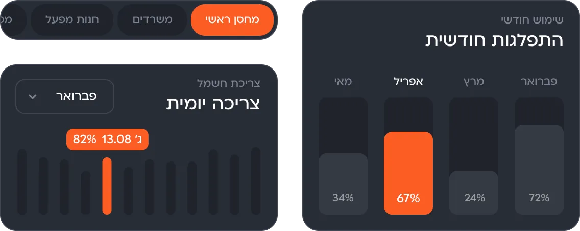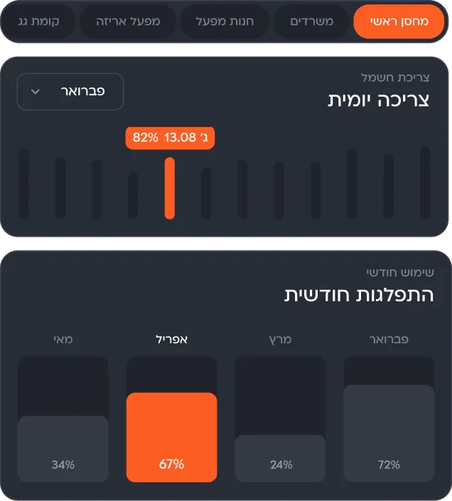 קבלת תמונת מצב מלאה של נתוני צריכת חשמל, שמאפשרת זיהוי חריגות, מניעת בזבוז והתייעלות אנרגטית לחיסכון כספי משמעותי.