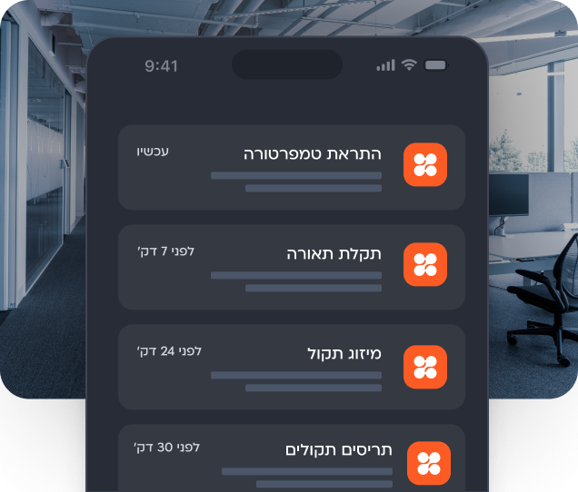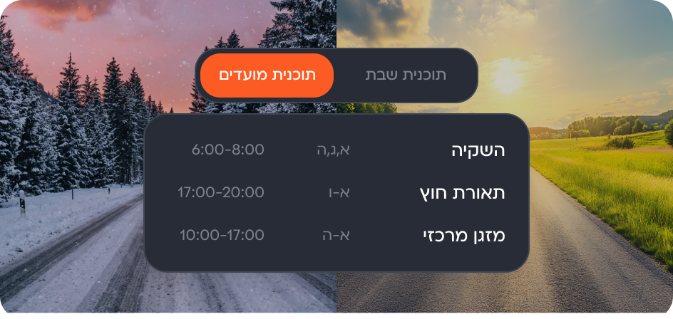 סנכרון מלא של מערכות המבנה לשעות הפעילות של הארגון. קביעת זמני הפעלה וכיבוי אוטומטיים לאזורים שונים, עם גמישות מלאה לביצוע שינויים מיידיים ללא צורך בתכנות מחדש.